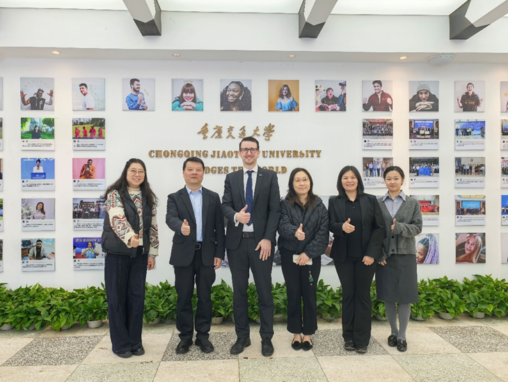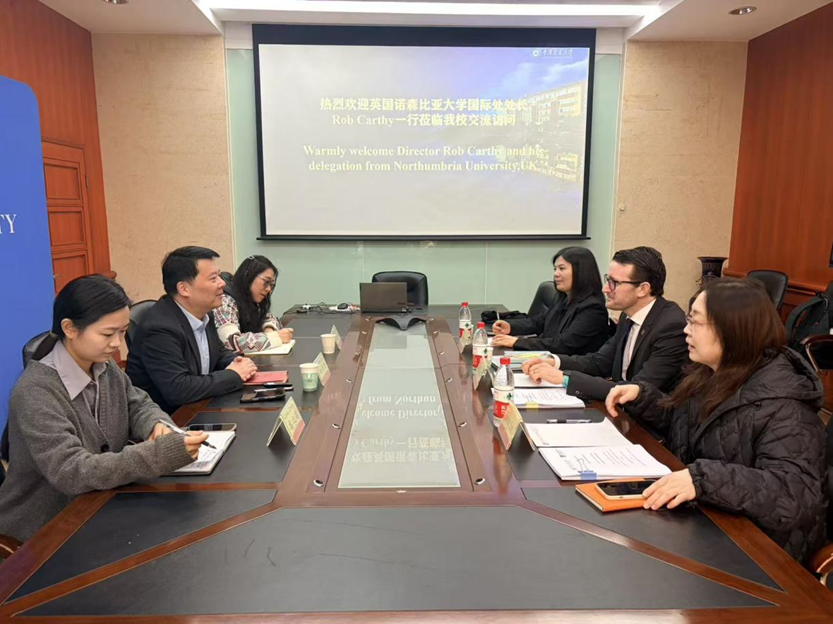 2026年3月26日上午,英国诺森比亚大学国际处处长Robert Carthy先生,中国区总负责人Sunny Sun女士,录取官Amy Yu女士一行3人到访重庆交通大学,学校国际处相关负责人在南岸校区国际交流中心接待来宾。与会双方围绕中外合作办学机构——重庆交通大学诺森比亚学院的合作方案进行深入交流,逐项研讨机构设置、专业建设、培养模式、管理机制等关键事项,务实推动合作办学从方案设计向申报实施稳步迈进。会议由国际处副处长徐厚智主持。